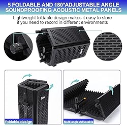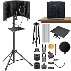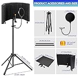 【Excellent noise reduction】Triple Sound Insulation,foldable Microphone Isolation with reflective layer+filter layer+absorbing layer.the high-density acoustic foam that eliminates audio wave bounces back and interference effectively.The reflection area and the absorption area reduce noise from external environments,works well to reduce ambient sound. 【Durable& Flexibility】Mic stand with isolation shield Constructed out of premium steel, the height is 78.7 inches (2 meters), the height can be adjusted freely, the support points of the sound insulation board are designed with anti-slip design, the screw parts are made of high-quality steel, and the back panel is made of strong and durable metal Material, made of flame-retardant and sound-insulating material, the studio microphone isolation cover can be placed on the table for use, or can be directly installed on the microphone stand. It is very suitable for standing performances and seated recordings. There are dual options for you to use. 【Safety & Adjustable&Versatility】Microphone isolation shield is equipped with a heavy-duty tripod, so there is no need to worry about the risk of unstable center of gravity and tipping over with a light touch.The stand can use it on a desk or mount it to a boom through the adjuster at any height to accommodate sitting or standing positions, could be adjusted quickly, conveniently and safely.Suitable for daily work, personal creation, recording studio,radio station 【Easy to Installation】Only take minutes to unfold this recording studio equipment, The 5 folding microphone shield panels are adjustable at 180°adjust the angle,and the included screw adapter makes it easy for you to adjust the tightness. The studio mic stand can be fixed on a desk or tabletop, and also can be mounted to a microphone stand. 【Intimate Details】There is an adjuster behind the microphone isolation shield studio microphone music recording, which can easily adjust the microphone isolation shield to the position you need that is height-adjustable from 42 to 71.5 in.Our accessories also prepare a pop filter for you to make your voice sound clearer,a 3/8" to 5/8"adapters that makes it suitable for the majority of the microphone,a storage tray allows you to place things like external sound cards or mobile phone [Tips after optimization] The microphone stand tube has been upgraded again. The package you received is different from the picture. Don’t worry. Both stand tubes are made of high-quality steel. The screws of the upgraded stand tube can be removed.