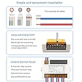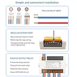 【Excellent Design】433Mhz RF wireless remote control switch.Stable and reliable performance with high reception sensitivity (> - 105dBm). Strong signal can pass walls, floors, doors.It can be controlled within 50 meters distance with no obstacle.You can remotely operate every machine connect with the relay receiver through the remote control. 【Easy to use】Extremely easy to set up and reset. There are 3 operating mode(momentary/toggle/latched mode) can be chose.You can easily set up by yourself depends on your needs. The operating mode of the product is adjustable.These product are tested before shipping, and programed in toggle mode. 【More Flexibility】 This receiver contain 2 10A relays, and there are 3 terminals(normally open, common, normally closed) for each relay.This 2 relays are independent, so that you can remote control each of them independently. This is a potential-free contacts relay. Passive output. Dry contacts. Each receiver can store about 20 transmitters. And One transmitter can control multiple receivers too. 【Quality Assurance】High-quality relay that can be used over 100,000 times.Let this product is more long-lasting and stable to use.The blue high-power terminal can withstand a current of 10A, so that this product can have a good effect even when the current is unstable. The receiver is suitable for 85V~240V voltage, it is more flexible to use. fitable for 110V 120V 220V 240V. 【Wide Application】Products can be used in homes, farms, factories, offices, laboratories, supermarkets and so on.You can remotely operate every device connect with the relay receiver through the remote control. such as, garage door, electric door, shutter door, expansion door and electric curtain, Motor, Lamp, lighting, ventilation device, Signal transmission and so on.