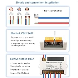 【Excellent Design】433Mhz RF wireless remote control switch.Stable and reliable performance with high reception sensitivity (> - 105dBm). Strong signal can pass walls, floors, doors.It can be controlled within 50 meters distance with no obstacle.You can remotely operate every machine connect with the relay receiver through the remote control. 【Easy to use】Extremely easy to set up and reset. There are 3 operating mode(momentary/toggle/latched mode) can be chose.You can easily set up by yourself depends on your needs. The operating mode of the product is adjustable.These product are tested before shipping, and programed in toggle mode. 【More Flexibility】 This receiver contain 4 10A relays, and there are 3 terminals(normally open, common, normally closed) for each relay.This 4 relays are independent, so that you can remote control each of them independently. This is a potential-free contacts relay. Passive output. Dry contacts. Each receiver can store about 20 transmitters. And One transmitter can control multiple receivers too. 【Quality Assurance】High-quality relay that can be used over 100,000 times.Let this product is more long-lasting and stable to use.The blue high-power terminal can withstand a current of 10A, so that this product can have a good effect even when the current is unstable. The receiver is suitable for DC 6V~30V voltage, it is more flexible to use. fitable for 5V 12V 24V 30V. 【Wide Application】Products can be used in homes, farms, factories, offices, laboratories, supermarkets and so on.You can remotely operate every device connect with the relay receiver through the remote control. such as, garage door, electric door, shutter door, expansion door and electric curtain, Motor, Lamp, lighting, ventilation device, Signal transmission and so on.
