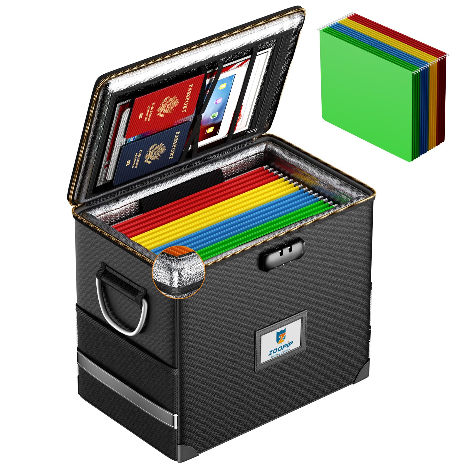 - ZOOPIP Fireproof File Box with Lock, Document Box Storage Organizer, Suitable for Hanging File Folders in Letter Size, Collapsible File Box, Reflective Strip for Fast Find (12.2"*6"*10.2, Black)