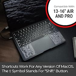 - 💻SYNERLOGIC MacOS+Word+Excel Reference Keyboard Shortcut Stickers ⚠️Designed for the MIDNIGHT BLACK Macbook Air 2022 or any other black surface.Your Synerlogic Essential Shortcuts Sticker is an accurate, comprehensive list of keyboard shortcuts that you need. It contains a list of shortcuts for any Mac OS, including Big Sur, and fits easily on the bottom corner of your Macbook so you can quickly look down and read it. It is perfect for the beginner who wants to learn how to use their Macbook and save time by having the key Macbook shortcuts at their fingertips. Designed by SYNERLOGIC, the sticker is made of military-grade waterproof vinyl and is more durable and convenient than a printout of the shortcuts.💻Convenience At Your Fingertips Are you looking to increase your productivity or simply want to learn how to use your shiny new Macbook like a pro? Having the most essential MacOS+Word+Excel shortcuts in front of you will help you quickly learn the ins and outs of your Mac. Whether for business or personal use, you’ll be able to easily navigate and operate your Mac computer so that you can work faster and smarter.💻Perfect For Learning Your MacbookIf you have a new Macbook and want to learn how to use it like a pro, this sticker is for you! You’ll have the shortcuts right in front of you, so you can learn and memorize them without having to look them up or print them out. You’ll be using your Mac computer like a pro with the Mac OS Reference Keyboard Shortcut Sticker.IT MAKES A PERFECT GIFT❣️Copyright ©2022 Design and production by Synerlogic Electronics, Bay City, MI, San Diego, CA and Boca Raton, FL, United States. All Rights Reserved.