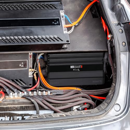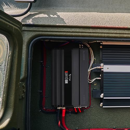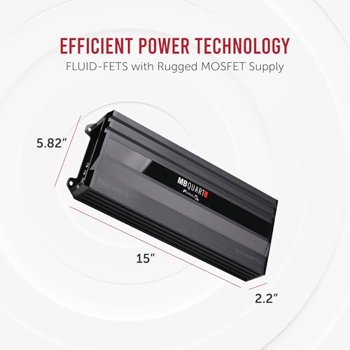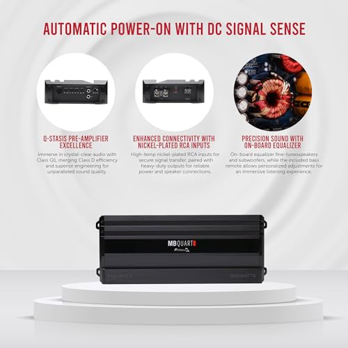 Immerse yourself in the ultimate sonic experience on the road with the MB Quart Formula 900-Watt 5-Channel Car Audio Mobile Amplifier. This 5-channel powerhouse delivers a staggering 900 watts of pure, dynamic power, transforming your vehicle into a mobile concert hall. The amplifier's low-noise pre-amplifier circuit and Q-Stasis pre-amplifier stage ensure that your audio signals remain pristine, free from distortion, and true to the original recording. High-temperature impact-proof nickel-plated RCA inputs guarantee secure and erosion-free connections, while heavy-duty output connections provide a robust electrical pathway for seamless signal transmission. Equipped with auto turn-on functionality and DC SIGNAL SENSE, the amplifier effortlessly springs to life upon detecting incoming signals on the RCA inputs, enhancing convenience and efficiency. Take command of your sound with variable electronic crossovers and an on-board electronic equalizer, tailoring frequencies with precision to suit your speakers and subwoofers. Class Q1 (Class D) amplification technology combines efficiency with a commitment to sound quality, while FLUID-FETS output device technology efficiently produces power while faithfully reproducing audio nuances. The heavy-duty heat sink and rugged MOSFET power supply ensure optimal performance without taxing your vehicle's electrical system. With LED system protection circuitry diagnostics, you can monitor overload and speaker short protection, guaranteeing longevity. The included bass remote also allows you to fine-tune bass response from the comfort of the driver's seat. Turn every drive into a symphony with the MB Quart Formula 900-Watt 5-Channel Car Audio Amplifier.