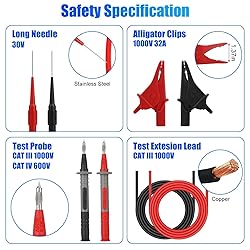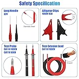 - Experience precision and safety with our premium silicone electrician test leads set! Rated for CAT III 1000V and CAT IV 600V at 10A, it’s perfect for home and industrial use with any multimeter. Featuring pure nickel-plated conductor tips and flexible, durable silicone leads, it ensures accurate results and quick responses. With alligator clips and needle probes, plus a comprehensive 25-in-1 toolkit, this set is your go-to for reliable testing in any environment. Contact us on Amazon for support!