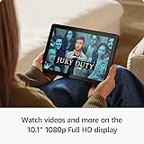 Do what you love, uninterrupted — 25% faster performance than the previous generation and 3 GB RAM are ideal for seamless streaming, reading, and gaming. High-def entertainment — A 10.1" 1080p Full HD display brings brilliant color to all your shows and games. Binge watch longer with 13-hour battery, 32 or 64 GB of storage, and up to 1 TB expandable storage with micro-SD card (sold separately). Thin, light, durable — Tap into entertainment from anywhere with a lightweight, durable design and strengthened glass made from aluminosilicate glass. As measured in a tumble test, Fire HD 10 is 2.7 times as durable as the Samsung Galaxy Tab A8 (2022). Stay up to speed — Use the 5 MP front-facing camera to Zoom with family and friends, or create content for social apps like Instagram and TikTok. Ready when inspiration strikes — With 4,096 levels of pressure sensitivity, the Made for Amazon Stylus Pen (sold separately) offers a natural writing experience that responds to your handwriting. Use it to write, sketch in apps like OneNote, and more. Save time, get creative - Enjoy three new smart tools to help you send polished emails, quickly summarize webpages, and create unique wallpapers. Family friendly — Amazon Kids offers easy-to-use parental controls on Fire tablets. Subscribe to Amazon Kids+ for access to thousands of books, popular apps and games, videos, songs, Audible books, and more. "Alexa, read my last book." — Ask Alexa to help with anything from recipes to jokes to reading, or to control your smart home devices. Designed for sustainability – This device is made from 12% recycled materials. 98% of this device packaging is made of wood fiber-based materials from responsibly managed forests or recycled sources.