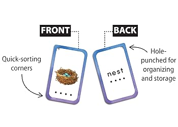 - Each flash card set contains a collection of full-color, high-interest student cards as well as instructions and tips for the teacher or parent, suggested activities, and additional blank cards. Each card has a hole in the top corner that can be fit with a ring or string to help with organization and storage. Additionally, each card has one corner that is shaped differently than the others. By lining up the non-rounded corners, the flash cards can quickly be faced in the same direction. When applicable, flash card sets include answers in small print on the reverse side of each card.
