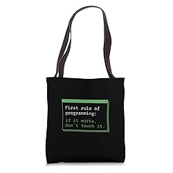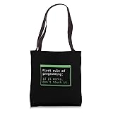 First Rule Funny Programmer Coder Html or Python Developer Designs for computer programmers coding engineers 16” x 16” bag with two 14” long and 1” wide black cotton webbing strap handles. Made of a lightweight, spun polyester canvas-like fabric. All seams and stress points are double-stitched for durability, and the reinforced bottom flattens to fit more items and hold larger objects. Spot clean/dry clean only.