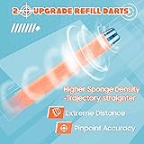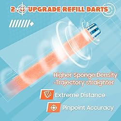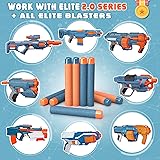 - AMOSTING 100PCS Refill Bullets Ammo Pack Compatible with Nerf Guns for Nerf N-Strike Elite 2.0 Series - Compatible with All Elite Blasters Toy Guns (Blue & Orange)-with Storage Bag -New upgrade: New color. The tip is made of plastic to keep long range shooting and more secure blow. Wear eye protection! Let the battle begin! BE AN ELITE WARRIOR AND STAY STOCKED WITH REFILL DARTS Universal bullets, these refill darts compatible with any Nerf guns that accept standard elite darts. Whether you have the Elite 2.0 Motoblitz, Commander, Shockwave, Eaglepoint, Disruptor, Echo, N-Strike Rampage, Strongarm, SurgeFire, Disruptor Elite, Modulus, DinoSquad Raptor or the Zombie Strike gun, these elite bullets for Nerf N-Strike Elite Guns will fire perfectly. Your gun ammo will have to stay fully stocked if you want to ensure your survival in the gun fight. Keep these refill darts by you at all times in the event that you may get attacked. This dart refill pack will give you the leg up on opponents that you're going to want during the ultimate showdown. GET BETTER PERFORMANCE OUT OF YOUR BLASTER NOW! These Elite 2.0 refill darts combined the upgrade designed head with higher density of the foam body, improved dart accuracy and shooting distance.