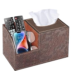 【Tissue Box with Remote Control Holder】 it's a tissue box cover with storage nooks.compatible with most brand tissue boxes. can hold all size remote controls and mobile phones.With such an inspired design,provide more convenience for life. This tissue box holder is cute and stylish and also has extra compartments to hold remotes, glasses, and phone. These keep all table“stuff” organized in one place.you will find it useful to have in your office or by your bedside. 【Easy to Store & Refill New Tissues】Tissue Box Cover Size-5x5.8x5.7 inches.(L*W*H)Fully compatible with 99% square tissue boxes. easily holds most brand tissue boxes. Also Fits large square tissue boxes. More convenient Refill New Tissues method It only takes seconds to replace the tissue box. open it from the top, place the total tissue box, then close the tissue cover. The tissue lid has a magnetic top, The top cover can be magnetically held firmly. 【Multi-Functional Tissue Box with storage】The tissue box cover and the 2 compartment are integrated into one. We are refer to the dimensions of remote control holder and phone size. Specially customized 2 large storage compartments. great for all remote controls ,mobile phone, glasses, or pencils/pens...enough to hold everything you need by your bedside table/ nightstand/ coffee table/end table/office desk. Everything is organized in one spot. 【Fits Your Decor Perfectly】Are you looking for a way to conceal those plain tissue boxes ? BLIENCE Tissue Box Cover :Made of high-quality materials: PU leather + MDF. sturdy and durable.The PU leather and stitching is a nice touch. The PU leather cover has exquisite embossed patterns and it turns an ordinary box of tissues into a object of art. Blends well with decor. Hide those dull tissue box and add a touch of style throughout your home and office. 【PERFECT AS GIFTS】 The decorative tissue box cover will be a perfect gift for you to share with your families and friends, it will match your home decor perfectly, add beauty and color to your home. And it's really an Ideal Gift for House warming, Wedding, Anniversary, Christmas, New Year!!!