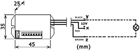 Specifications: switch type: relay detection angle: 100 degrees detection range: 26 ft. (at 70 F) rated load: 25 W resistive load (maximum inrush current 2.1 A) input: 12 Vdc +- 1V, 2.6 A output: max. 12 Vdc 2.5 A / 25 W quiescent current: 5 mA current with energised relais: 50 mA working temperature: -10 C to +40 C working humidity: