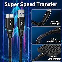 【Fast Data Transfer and Sync】: USB 3.0 A to Micro B Cable Transfer super speed up to 5.0Gbps, it only takes 20 seconds to transfer a 10GB file, 10X USB 2.0. Data transfer and power charging 2 in 1. 【Premium Material】: Kxable USB 3.0 A to Micro B cable is made of pure copper wires. Hard nickel plated connector and multi-layer shield are used to minimize signal loss. The light and thin aluminum alloy shell(with shinning edge) is corrosion resistant and can achieve the best heat dissipation. 【Unique design】: Anti-rupture SR (Strain Relief) and nylon braided jacket (can bear 10000+ bending test) which makes it has excellent texture and without worrying about wear and kinks. 【Broad Compatibility】: Suitable for most USB 3.0 external portable and desktop hard drives. Compatible with Samsung Galaxy S5 / Note 3 / Note Pro 12.2 / N9000, External Hard Drives (Seagate Toshiba Canvio, and Western Digital (WD) My Passport and Elements hard drives), Solid State Drive (SSD). In addition, it supports data synchronization and charging of smartphones and cameras, such as Pentax cameras, Nikon D800/D800E, EOS 5DS/5DSR/5D4/1D X Mark II cameras). 【Worry-Free Service】: We offer a one-year warranty for these cables. If you have any questions, please contact us and our professional customer service will reply to you within 24 hours.
