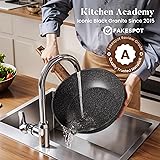 Kitchen Cookware & Bakeware Set 30 Piece - Include 5.5-inch fry pan / 8-inch fry pan / 11-inch fry pan / 9.5-inch deep fry pan with lid / 9.5-inch square steak fry pan / 1.5qt saucepan with lid / 3qt casserole with lid / 5qt casserole with lid / 5qt steamer / Baking form:14"x9.2"x2.2" / Baking form:11.6"x6"x2.5" / Rect baking tray 14.6"x9.8"x2.2" / Round spring form 10"x2.5" / 12 cup muffin pan:16"x10"x1.3" / 3 pcs silicone utensils / 3pcs ceramic knives / 6 pcs dining placemat Nonstick Pots and Pans Set - When buying cookware, one of the important things is nonstick capabilities. The graniteware coating do a good job in preventing food from sticking. Also, you'll be able to cook healthier meals for your family since you won't have to use as much oil. You can safely cook tomato sauce in granite cookware cookware, the taste and smell of your food will not change even if you use acidic or strong-smelling ingredients Toxin-free Cooking Set - When buying a new set, make sure that it clearly indicates that it is lead, PFOS, PFOA-free. These are the three things that you don't want to have in your cookware because of their potential health dangers. Fortunately, you can get granite cookware that are free of these harmful chemicals.For a healthier lifestyle Induction Cookware Sets - When it comes to the interior, this cookware uses an aluminum core. The result is that the pan heats up quickly, and more importantly, distributes heat evenly. The cookware set works on all major types of cooktops. Larger high magnetic conductive stainless steel base ensure induction compatible, especially glass stove Pots and Pans with Bakelite Handle - Bakelite is used because it has heat-resistant properties and is an electrical insulator. Bakelite would not burn when exposed to high heat. Bakelite is safe up to 350 degrees F, for a limited time. Dark bakelite handle is more stain-resistant and easy to clean too Great Quality & Service - Quality first, Service Utmost. Each Kitchen Academy cookware passes a strict multi-inspection process. If you meet any problems, don't hesitate to contact our 24/7 online customer service which will reply to you ASAP to help with your worries