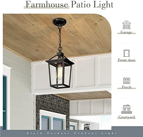 - 【FARMHOUSE DESIGN & WEATHER RESISTANCE】: Featuring an industrial lantern design, this outdoor pendant light is made of die-cast aluminum in a black finish with a seeded glass shade. Waterproof and anti-rust, it was durable while creating a chic and modern look in your house.
