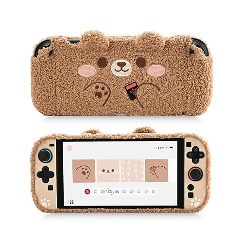 - GeekShare Plush Bear Protective Case Compatible with Switch OLED Model Features in: Full Protection -- Made of PC and plush material, strong and durable. Protects your Switch OLED from daily collisions, scratches, dust, and splashes. Strong protection and Comfortable -- This protective case is sturdy but comfortable and the breathing hole will not make your consoles be hot, makes playing more comfortable. Split Design -- This protective case of OLED Switch is easy to install and remove. No need to taking off the cover case, so you can enjoy the game in the way you prefer. Item Specifications: Material -- PC + Plush Color: Brown Package Includes: -- 1 X Switch OLED Protective Shell -- 1 X Playstand Note: 1. Designed specifically for the Switch OLED only, not suitable for regular Switch/Lite. 2. All Switch accessories shown in images are for usage demonstration purposes only and are not included in the package. 3.Please Note: Colors shown in pictures may slightly differ from actual product due to lighting and color settings.