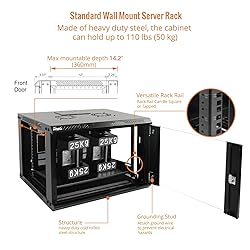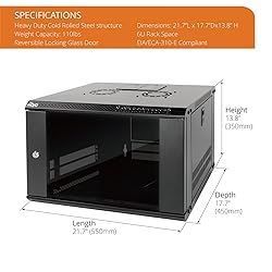 Save valuable floor space: 6U wall mount server cabinet Dimensions: 13.78" H x21.65" W x17.72" D.Maximum mounting depth is 14.2" Keep critical network equipment secure: glass door and side panels are lockable to prevent unauthorized access. Front door can be installed on either side of the front of the cabinet to satisfy your door swing orientation preference Easy equipment configuration: Fully adjustable mounting rails and numbered U positions, with square holes for easy equipment mounting with top and bottom punch-out panels for easy cable access Durability: Made of high quality cold rolled steel holds up to 110lb (50kg) (Easy Assembly Required) PCI & HIPPA and EIA/ECA-310-E compliant