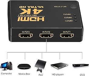 hdmi Switch switcher Box with Remote Control selector 4k 3 Ports Compatible with Xbox PS5/4/3 Blu-Ray Player Fire Stick Roku Nintendo Switch, HD-DVD, Sky-STB, Xbo360 and Other Audio and Video Devices