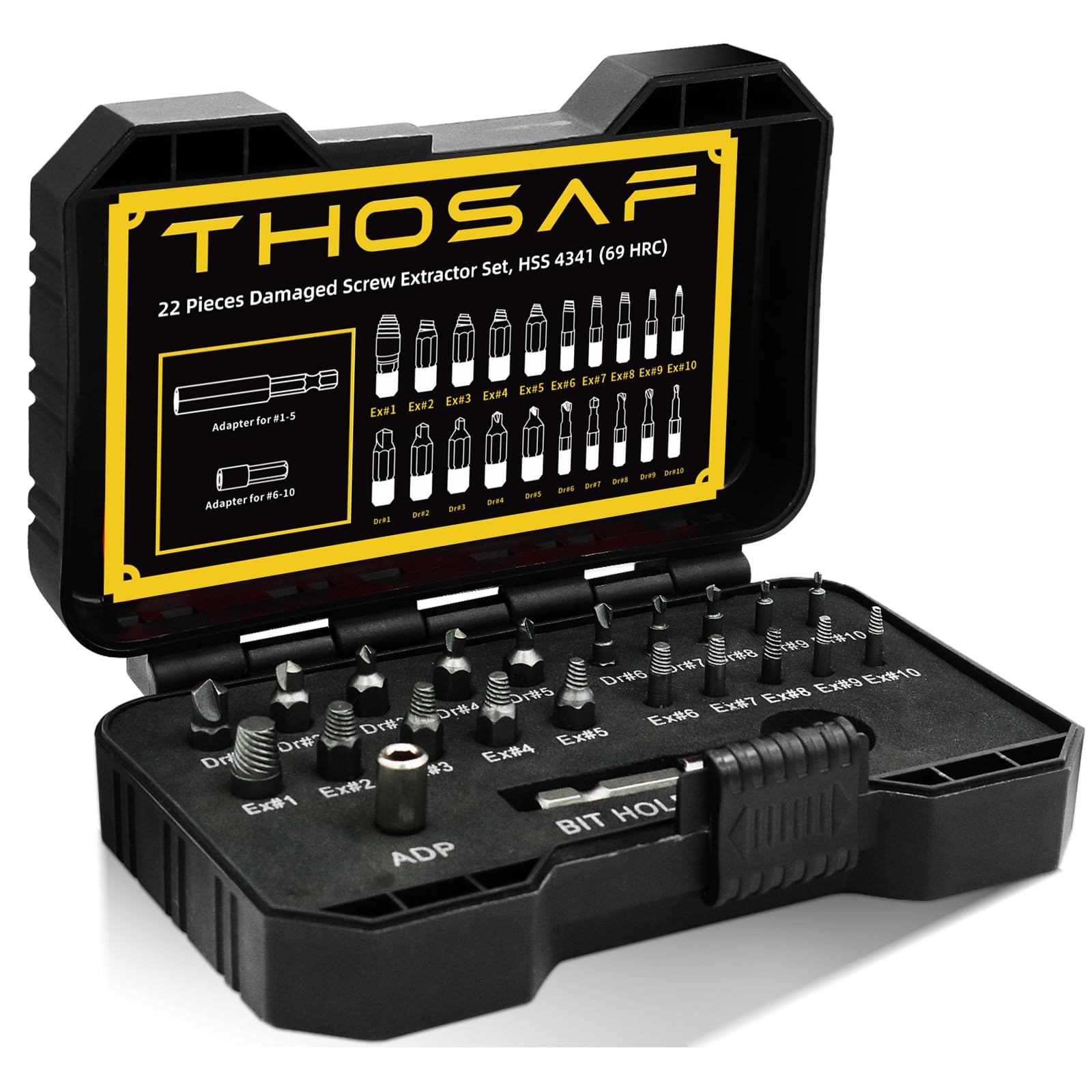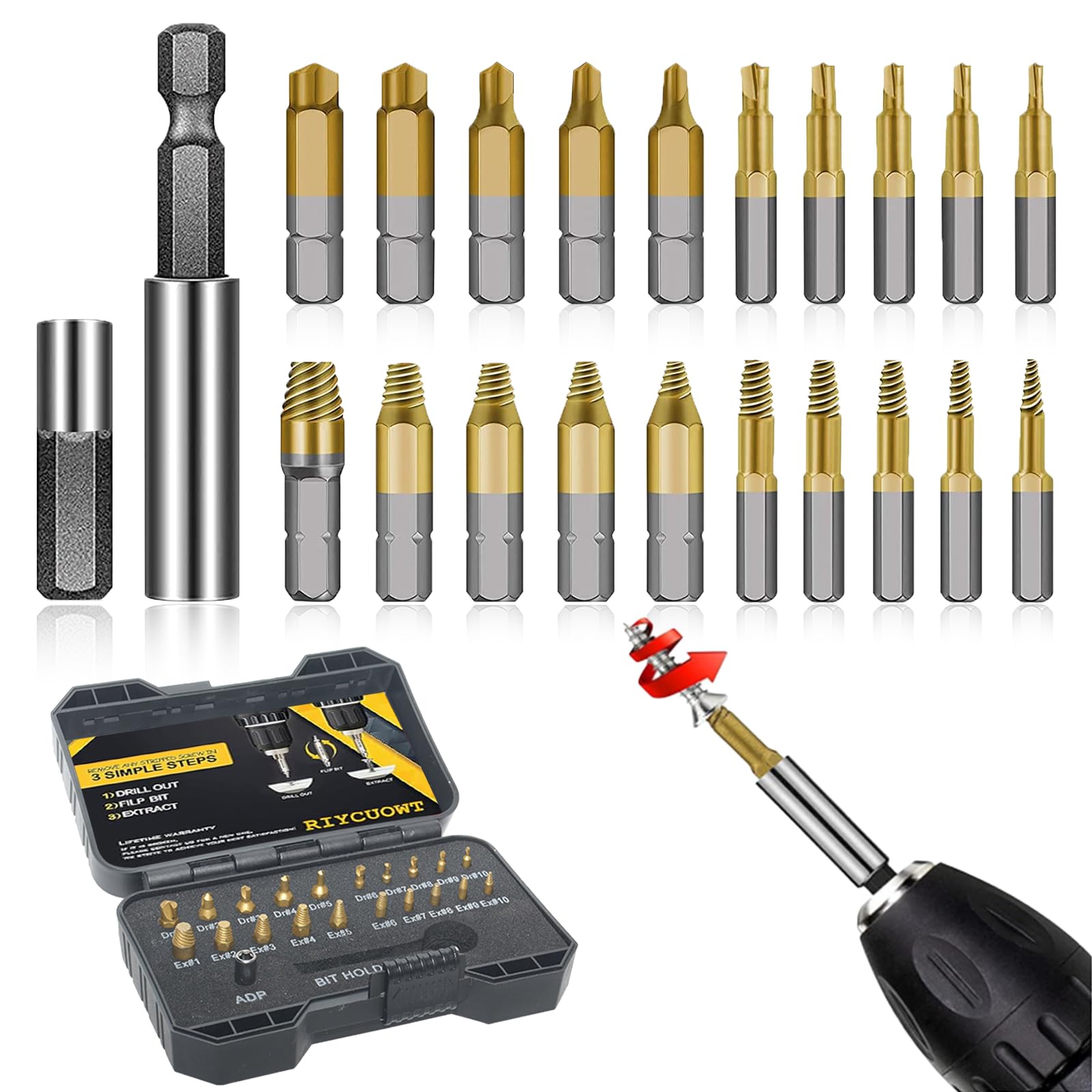 FÁCIL DE USAR: Solo dos sencillos pasos para hacer el trabajo - perforar un agujero con un tamaño de corte usando el extrator de tornillos del tamaño correcto y fácilmente retirar el tornillo o perno usando la herramienta de extracción. Dureza 63-65HRC: Material de acero endurecido de titanio, más duradero que la mayoría de los extratores de tornillos en el mercado, mejor dureza y durabilidad que otros, compre con confianza y total tranquilidad