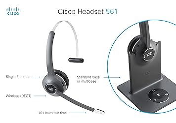 ENHANCED MOBILITY WIRELESS & SECURITY: The Headset 561 (single ear cup) DECT technology provides users the freedom to roam up to 300 ft from the multi-source base (connected up to 3 devices) with secure crystal-clear audio and up to 9 hours of talk time PREMIUM AUDIO, NOISE ISOLATION & CONTROL: Our comfortable, all-day wear design creates a full and rich sound that makes collaboration easier and music more enjoyable. On-ear controls allow access to key call control capabilities, mute/unmute, and volume COMPATIBILITY: Cisco DECT headsets are optimized for Cisco Jabber/Webex devices/computers with USB-A ports. Also, compatible with Cisco IP Phones with USB-A, Bluetooth and/or RJ-9/AUX ports including 6851/6871/6900/7800/8800 models INTEGRATED SERVICEABILITY: Easier to deploy, manage, and service when using Cisco headsets with Cisco Unified Communications Manager, Cisco Webex Control Hub, and Cisco devices Covered by Amazon Renewed Guarantee