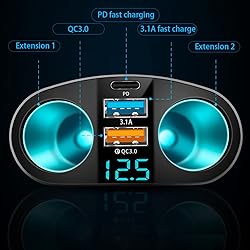 【QC3.0 Fast Charger & 5 in 1 Car Charger】: This car charger converts your car cigarette lighter from 1 socket to 2 sockets, in addition to it has 2 USB ports and a type-C port. Quick Charge 3.0 Make the device power reach more than 95% within one hour, making it ideal for charging multiple devices at the same time. It will play an important role in your journey with your family and friends. 【360 Degree Swiveling Head】: This car charger is suitable for all kinds of model cigarette lighters, can be adjusted 360 degrees, and has an ultra-convenient design to provide greater efficiency and convenience for your car. It can reduce equipment wear and extend its service life. This splitter is not bulky and it's a nice sleek design. 【LED Voltage Display】: Intelligent real-time voltage detection and LED screen display, timely monitoring of your car battery, to avoid the situation of running out of power and so on. If the voltage of the car is 11.6~14.8V, it means that the voltage is in the normal range. If the voltage is lower than 11.6V, it means that the voltage is too low and the vehicle needs to be checked. If the voltage is higher than 14.8V, the voltage is too high. 【Easy to Install】: The smart chip provides multiple safety protections to effectively reduce problems such as short circuit or overload. This car charger can provide temperature protection, overcurrent protection, short circuit protection, overcharge protection, etc. Furthermore, it has a good heat dissipation function, which can maintain a certain temperature after a long time of charging. 【Wide Compatibility】: Cigarette lighter is suitable for 12-24V vehicles, suitable for dashcam, car charger, smart phone, car electronic dog, etc. It also boasts a wireless design, flexible rotation, plug and play, stable and non-slip installation, and charging without interruption even on bumpy roads.