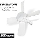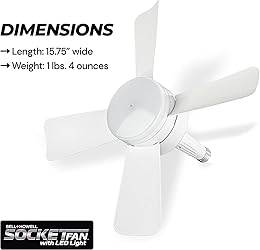 C𝗲𝗶𝗹𝗶𝗻𝗴 Fa𝗻 𝘄𝗶𝘁𝗵 LED L𝗶𝗴𝗵𝘁: Socket Fan by Bell + Howell allows your to get two uses out of one standard electric socket. The Socket Fan is both a ceiling fan and a super bright LED bulb in 1 unit, so you can illuminate and circulate air around your room without spending for two different products H𝗼𝘄 𝗱𝗼𝗲𝘀 𝗶𝘁 𝘄𝗼𝗿𝗸: Socket Fan is a screw-in unit that you use as you would a standard lightbulb and operates using electricity. You can use the included remote or existing wall switch to turn unit on. Fan can be turned on while keeping lights off or vice versa S𝘂𝗽𝗲𝗿 B𝗿𝗶𝗴𝗵𝘁 a𝗻𝗱 C𝗼𝗼𝗹: 1,000 Lumens of super light will illuminate any dark room around your home; Model 8563 “Cool Light” comes with 5,000 cool color kelvins, for a more natural-colored bright light that’s easy on the eyes and reduced heat production Ea𝘀𝘆 I𝗻𝘀𝘁a𝗹𝗹a𝘁𝗶𝗼𝗻 a𝗻𝗱 W𝗶𝗿𝗲𝗹𝗲𝘀𝘀: Compared to traditional ceiling fans, the Socket Fan easily installs as you would a regular lightbulb, while also making it completely wireless and clutter-free. E26 base is compatible with most light bulb sockets S𝗺a𝗿𝘁 R𝗲𝗺𝗼𝘁𝗲 C𝗼𝗻𝘁𝗿𝗼𝗹: Remote Control has 3 buttons: Light, Fan, and Off Button. Press Light Button several times to cycle through brightness modes (low, medium high and off); press Fan button to cycle through power settings (low, medium, high and off); Off button turns off both fan and light. Remote comes with mount you can install on to vertical surfaces (installation hardware comes included) D𝗶𝗺𝗲𝗻𝘀𝗶𝗼𝗻𝘀 a𝗻𝗱 F𝗲a𝘁𝘂𝗿𝗲𝘀: This white ceiling fan product dimensions are 15.4 x 15.4 x 4.92" from blade tip to blade tip and weighs a compact 1 pound and 4 ounces. The ceiling fan with light is screwable into any light socket and includes a socket extender, allowing you to simply install and remove the fan whenever and wherever you desire
