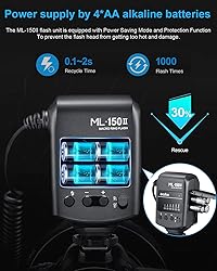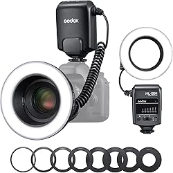 - Compatible with DSLR cameras with a hot shoe, the ML-150 II Macro Ring Flash from Godox illuminates your subject with soft, nearly shadowless light that reveals every detail. The ring light consists of two components: a controller, which slips into your camera's hot shoe, and the ring flash, which mounts on your lens. Godox includes 49, 52, 55, 58, 62, 67, 72, and 77mm adapter rings to insure wide compatibility. The control unit is the brain and power pack of the system. The manual unit can regulate light intensity in 11 steps and recycles in 0.1 to 2 seconds and runs on four AA batteries that give you 300 to 1000 flashes.