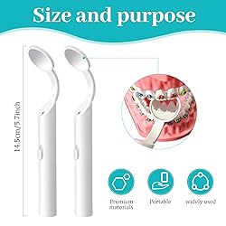 - 2 Pieces Dental Mirror with Light - LED Lighted Teeth Inspection Mirror, Anti Fog Curve Angle Mouth Mirrors Dentist Oral Assistant Care Tool Accessories Specifications: Material: ABS Plastic Color: White/Blue Quantity: 2 pieces Features: The dental mirror is made of high-quality ABS plastic material, which is safe, non-toxic, and durable. The LED light provides a clear and bright view of the teeth, making it easier to inspect and diagnose dental issues. The anti-fog design ensures that the mirror remains clear during use, even in humid environments. The curve angle of the mirror allows for easy access to hard-to-reach areas in the mouth. The mirror is an essential tool for dentists, oral assistants, and individuals who want to maintain their oral hygiene. Easy to use and clean. Package Content: 2 pieces LED lighted dental mirrors with batteries included.