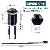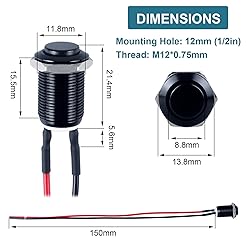 - Experience reliable and durable switching with our DMWD 5-pack of 12mm Latching Push Button Switches. These robust switches feature a raised head design, offering a secure ON-OFF functionality with a simple push. Crafted with an aluminum alloy shell and silver alloy contacts, they ensure high conductivity and longevity, with an electrical life of 100,000 cycles and a mechanical life of 500,000 cycles. Measuring 12mm in width, 17mm in length, and 12mm in height, these switches are compact yet sturdy, making them ideal for various applications such as cars, computers, and home appliances. They are also waterproof (IP66) and anti-vandal (IK09) rated, ensuring they can withstand harsh environments. Each switch comes with a pre-soldered cable, making installation a breeze. Suitable for voltages ranging from 12V to 110V, these switches are versatile and reliable, perfect for a wide range of projects.