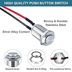 Latching Push Button Switch: Push it-ON, Push it again-OFF; Electrical life: 100, 000 times, Mechanical life: 500,000 cycles Mounting Hole: 12mm(1/2"); Structure: 1 Normal Open; 0-250V without LED High Quality: Stainless Steel Case and Silver Alloy Contact make the switch more durable and with high conductivity; The switch can be used in complex enviroment with waterproof IP66 and anti-vandal IK09 Wide Application: Suitable for car, computer, instrument and meter industry, door bell, home appliance etc. Package Content: 5pcs Switches with Pre-soldered Cable