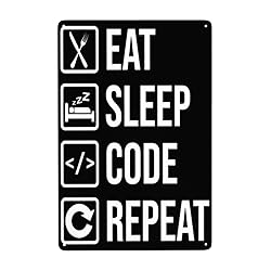 - Funny Computer Programmer Saying Eat Sleep Code Our metal signs are made to look bright and vibrant. This high-quality wall art decor allows you decorate in your own unique style! Your family, colleague and friends will love the look of our tin signs. Funny metal sign is a perfect gift for all occasions, Made with High-quality METAL, These metal signs are Waterproof, Durable, Colorfast and Easy to clean. Our Funny tin signs will delight your family, colleagues and friends. This funny metal tin sign comes with 4 pre-drilled holes (screws or nails not included) for easy hanging, you can also use sticky hooks, mounting tape or wire to install. The man cave sign is the perfect addition to your home bar area decor, adding a sense of humor and joy to your patio, basement, garage, office, man cave bar. Bar sign are printed by waterproof high-definition digital printing ink, It takes more genuinely vintage impressions. It will keep beautiful colors, no matter the sun & rain, or other extreme weather.