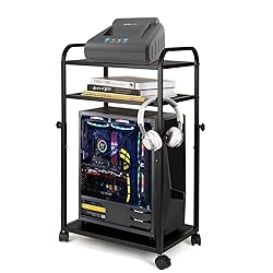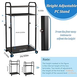 Adjustable Height PC Stand: Computer tower stand length: 16.93 inches, width: 11.81 inches, internal height can be adjusted from 19.69 inches to 22.05 inches to adapt to different heights of PC chassis. Attention: Please pay attention to the size before purchasing. Sturdy Material: The PC tower stand made of thickened iron material helps to firmly support most computer towers. The structure is stable and not easily deformed, and the simple and atmospheric black color can integrate with the surrounding environment. 3-Tier CPU Stand: The 3-tier design increases the storage capacity of the tower stand. The adjustable height shelf meets most storage needs, and items such as PC cases, printers, books, etc. can be placed. And the middle layer board adopts an iron mesh design, which is beneficial for the computer tower to breathe freely and accelerate heat dissipation. Mobile PC Holder: Four 360°rotating universal wheels can easily move on the carpet, aiming to improve mobility and stability. And with brake casters, it can be kept stationary when needed, making it easy to clean the ground. Easy to Assemble: We provide the necessary parts for installation and step-by-step assembly instructions, allowing you to easily install this pc stand in just a few minutes.