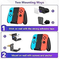 MOUNT YOUR SWITCH: This nintendo switch wall mount kit helps you store the switch, game cards, and Joy-con, freeing up valuable space on your desktop. You can install the switch next to or behind your TV to provide you with the best gaming experience on the big screen. The wall mount kit is compatible with Switch/Switch OLED 2 JOY-CON HOOKS & 2 CONTROLLER HOLDER: This switch wall mount kit comes with 2 controller wall mounts, and the switch wall mount has 2 extra hooks for the Joy-Con. Compatible with Joy-con, Switch Pro Controller, and Joy Con Comfort Grips 28 GAME CARD SOLTS: The switch wall mount kit has a slot for 28 game cards, You can put your frequently played games in this 28 game card slot so you can find them quickly the next time EASY TO INSTALL: You can install this wall mount quickly and easily, using only a screwdriver and 3 screws to secure the Switch wall mount to the wall. Double-sided adhesive installation is suitable for smooth walls, wait 24 hours after installation before use PACKAGE INCLUDES: 1 x switch wall mount, 2 x controller wall mount, 1x 28 Game Card Slots, 1 x screwdrivers, 3 x Screws, 3 x Expansion Screws, 1 x double-sided tape, 1 x installation manual