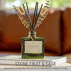 - Introducing the Green Bottle Reed Diffuser with Dried Flowers, a perfect addition to your home decor and ambiance. Crafted with care, this elegant reed diffuser combines stylish design with enticing fragrances to create a soothing and inviting atmosphere in any room. With five captivating scents to choose from, you can transform your space: Stone Fruit & Sage: Experience the delightful blend of juicy stone fruits, such as peaches and plums, harmoniously complemented by the earthy and herbaceous notes of sage. This scent will envelop your senses and transport you to a serene orchard. Eucalyptus & Sicilian Citrus: Refresh your surroundings with the invigorating fusion of cooling eucalyptus and zesty Sicilian citrus. This uplifting combination will awaken your senses and create an energizing ambiance that revitalizes your mind. Wild Lavender: Immerse yourself in the soothing embrace of wild lavender. This classic floral scent offers a serene and calming experience, helping you unwind after a long day and promoting a peaceful atmosphere for relaxation. White Peony Tuberose: Indulge in the alluring fragrance of white peony and tuberose. The delicate floral notes blend effortlessly, creating a romantic and sophisticated atmosphere that fills your space with elegance and charm. Santal Woods: Envelop your surroundings in the warm and comforting embrace of Santal Woods. This rich and woody scent combines sandalwood and other aromatic woods to create a cozy and inviting ambiance that will leave you feeling grounded and at ease. Each reed diffuser comes in a stylish green bottle that adds a touch of elegance to any room. Accompanied by dried flowers, the diffuser serves as a stunning visual accent that enhances the overall aesthetic of your space. To use, simply insert the reeds into the bottle, allowing them to absorb the scented oil. The reeds will then release the fragrance into the air, gently diffusing the captivating scents throughout your home. Adjust the number