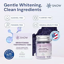 - Snow Instant Brightening and Color Correcting Tablet for Teeth combine advanced SNOW Purple Teeth Whitening Technology with gentle yet powerful ingredients to deliver instant whitening while neutralizing yellow stains from coffee, tea, and smoking. These compact, TSA-approved snow tablet toothpaste are ideal for travel, offering mess-free convenience for maintaining your oral care routine on the go. Designed for everyday use, these chew-and-brush SNOW whitening tablets provide enamel-friendly whitening and remineralization without harsh chemicals or invasive procedures. Whether you need instant brightening, color correction, or advanced whitening, the SNOW instant teeth brightening purple tablets revolutionize your daily oral care routine with ease and effectiveness.