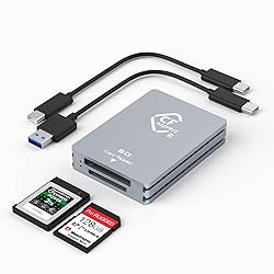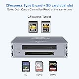 Professional CFexpress Type B/SD Card Reader: The dual-slot professional CFexpress card reader is compatible with both CFexpress (Type-B) and SD cards, making it the ideal card reader for photographers to carry around. This cf express cards type b reader adds a SD slot providing a great convenience for those who love photography or videography and use CFexpress card. 10Gpbs Super Speed Data Transfer: USB 3.2 Gen 2 technology supports maximum transfer speed up to 10Gbps(1250MB/s), support Cfexpress memory card read and write high-resolution photos, full HD videos from your CFexpress Type B card quickly. Backward compatible USB 3.1 Gen 1 and USB 3.0. LED indicator will flicker when data transfer is ongoing. Strong Compatibility: CF express cards type b reader strongly compatible with CFexpress type B(SanDisk/Sony/ProGrade/ Lexar /TOPSSD CFexpress Type B series) and SD Card(SD, SDXC, SDHC, RS-MMC), supports maximum capacity of CFexpress card up to 2TB. Plug and play, hot-swapping capability. If the CFexpress card and SD card are inserted at the same time, the CFexpress card is read by default; The SD card will be automatically disconnected after the CFexpress card is inserted. Dual Cable Design and Portability: This CFexpress/SD card adapter comes with one USB C to USB C cable and one USB C to USB A cable, the dual cable designed to be compatible with all USB type C and USB A device. Aluminum Enclosure & Compact Design: Dual-slot card reader for cfexpress sd card with ultra slim body design, portable for vacations and business trips, let photography become a pleasure. The Aluminum Enclosure is more conducive to heat dissipation and makes the cf express b /sd card reader more durable. (Package contents: 1 x CFexpress Type B /SD Card Reader, 1 x USB-C TO C Cable,1 x USB-C TO A Cable, 1 x User Manual).