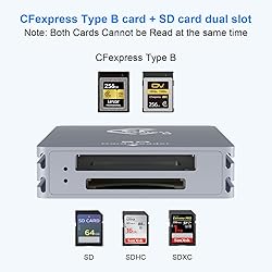- Type B CFexpress & SD Card ReaderCFexpress Slot: Designed for SanDisk/Sony/ProGrade/ Lexar /TOPSSD CFexpress cards Type B seriesSD Slot: Designed for SD, SDXC, SDHC, RS-MMCHigh-Speed CFexpress AdapterUSB3.1 GEN 2 CFexpress card reader standard speed allows you to transfer HD videos and photos in seconds. support speeds up to 10Gbps.No HeatBuilt-in high-quality chip, no heat, stable transmission without interruption.CFexpress memory Reader Plug & PlayType B CFexpress Card Reader Easy to set up, plug and play. No driver needed. Hot swapping and auto detection.LED indicatorThrough the LED indicator, you can easily monitor the connection status. CFexpress SD Card Reader built with Voltage and current protection to ensure the safety of your devices.Package Includes:1 x SD and CFexpress type b Card reader1 x USB-C TO C Cable ,1 x USB-C TO A Cable1 x User Manual