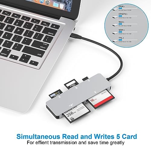 - 5-in-1 Cfast Reader: This multi memory card reader satisfies your need of almost every single card. There are 1*CFast slot, 1*SD, 1*Micro SD, 1*CF, 1*XD at your choice and convenience. What’s more, this card reader can Simultaneously read and write on five cards, eliminating the effort of plugging in and out and saving more time when sync data. which can greatly improve your work efficiency