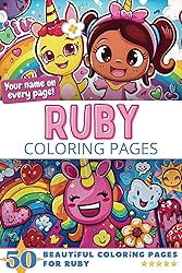 - Spark Ruby's imagination and celebrate her unique spirit with this special coloring book: "Ruby's Coloring Pages". This personalized treasure is specially designed to really captivate Ruby with its vibrant illustrations and charming characters. All centered around her very own name! In your Ruby Coloring pages, your little girl becomes the star of her own artistic journey. With her name elegantly featured in the heart of each of the 50 coloring pages, Ruby will feel an instant connection to the magical world that unfolds before her eyes. Each page is a showcase of everything she adores. You will find a wide range of themes, for example:Fantasy: Pirates, UnicornsBaking: Cupcakes, Cakes, Whip Cream, Pies, DonutsSchool: Books, Scissors, Paint, Letters, PencilsFood: Strawberries,Hot Dog, Melons, Taco, Grapes, Cherries, Apple, Banana, PizzaSealife: Beach, Pirates, Dolphin's, Shells, Sharks, Squid, Palm TreeSweets: Ice cream, Milkshake, Lolly, Candy, Chocolate, CookiesHolidays: Halloween, ChristmasShapes: Hearts, Diamonds, Emoji's, Flowers, Rainbows, StarsWeather: Clouds, Sun, Rain, Umbrella, SunglassesBirthdays: Presents, Party hats, Candles, Balloons, Birthday CakeAnimals: Mouse, Parrot, Tiger, Birds, Chickens, Elephant, Butterflies, Fish, Cats, DogsAnd many, many more themes for Ruby! Ruby Coloring BookWhat makes your Ruby Coloring Pages truly extraordinary is its personalized touch. Each book is custom-made with the name of Ruby integrated into the illustrations. Imagine the sparkle in Ruby's eyes as she discovers herself as the star of the book, surrounded by delightful characters and mesmerizing scenes. This really is your perfect coloring book for Ruby:All unique designsVisuals and theme's that girls likeStimulates Ruby's fantasyImproves her motor skillsOnly one side printed of each page to prevent bleedDevelop Ruby's artistic talentGive Ruby hours and hours of coloring fun50 Ruby coloring pages with her name in the middle Great Quality6x9" Compact edition (15,24 x 22,86 cm): easy to store and to take travellingElegant mat cover with full color print (Wow-factor gift)Black & white coloring pages90 grams, premium quality paperOne sided print on individual page to prevent bleedLandscape coloring orientationSuitable for pencils, paint, markers and crayons100 pages (50 Ruby coloring pages) Transforming Ruby's dreams into reality: Create, Color, and Decorate!With your coloring book, Ruby can unleash her creativity beyond the pages! Each illustration is designed for more than just coloring—it's a gateway to endless possibilities. Cut out a page, color, and proudly display the masterpieces for example on the bedroom door, on personal (storage) boxes, school maps etc. etc. Your imagination is the limit! Ruby Coloring Pages: ideal giftWhether it's a delightful surprise for Ruby's birthday, Christmas, a cherished gift for a special occasion, or a personalized treat to celebrate her uniqueness, Ruby Coloring Pages is a heartfelt keepsake she'll adore. Watch Ruby's eyes light up with joy as she dives into a world where her imagination will have no bounds. Don't wait any longer... Order your Ruby's Coloring Pages NOW!