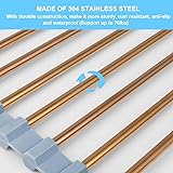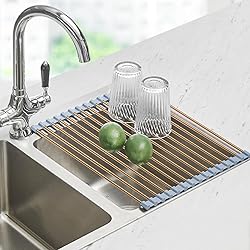 OVER SINK DISH DRYING RACK: 17.5 x 11.8 inches dish racks for kitchen counter. Suitable for most kitchen sinks, such as home kitchen sinks, rv sinks, camper sinks, etc. NOTE: NOT for farm’s sink with a side not level. This kitchen dishrack is ONLY suitable for sinks shorter than 16.7”. Please measure sink width(the shorter side does NOT exceed 16.7”) before purchase. STURDY STAINLESS STEEL DISH RACK: This gold dish strainers for kitchen counter are made of food safe grade 304 stainless steel with strong construction and great stability. Heavy duty and sturdy to support up to 33lbs without bending, suitable for drying pots, pans and other heavy cookwares. NOTE: clean and dry the dish racks after each use to prolong the service life. Perfect drying rack kitchen essentials for kitchen & table linens. FOLDABLE DISH DRYING RACK: This over sink drying rack with rolling design can be easily and quickly unfolded over the sink when in use, and go in a drawer or locker quickly when not in use. Compared to bulky wire shelf rack or dish drain basket with drainboard, this small dish drying rack saves your kitchen counter space with ease. The best RV kitchen accessories for small countertop and travel trailer must have accessories. NON SLIP SILICONE DRYING MAT: Composed of 15 stainless steel tubes and fixed firmly by silicone, the kitchen sink mats can lay flat over the sink without sliding and bending. With soft-touch silicone at both edges, the drying rack for kitchen sink is protects the sink countertop from scratches. Great kitchen sink accessories, kitchen gadgets and sink organizers for kitchen organization and storage. SPACE SAVING KITCHEN DRYING RACK: The rolling kitchen sink rack can be used as a sink cover over sink to expand kitchen counter space. Holding cutting board when chopping veggies and easy to put away after use. Water drains into the sink without messing all over the counter, making kitchen more tidy and organized. The rolling rack for dishes is a perfect kitchen space saver for rv storage and organization, great rv accessories for inside kitchen, new apartment essentials and kitchen must haves. HEAT RESISTANT DRY RACK: The stainless steel dish drying rack with good heat resistance up to 400°F (204°C), can be used as a heat-resistant trivet or dish drying pad on the countertop for hot pots, pans, baking sheets.Made of food safe grade material, this roll up drying rack over sink is safe for cooling hot food, such as cookies, bread on it, or thawing frozen meat from refrigerator.A perfect home and kitchen sink protectors for kitchen sink to protect your kitchen countertop or dining table. MULTIFUNCTIONAL DRYING RACK FOR KITCHEN COUNTER: This dish dryer rack not only can be used as an over sink dish rack for air-drying kitchenware, such as washed plates, bowls, cups, pots, etc., but also as a over the sink colander for fruits and vegetables,cooling rack or dish drying mat to place a hot pot or baking sheet, or a counter extender for holding chopping board for food prep.This versatile dish drainers for kitchen counter is a good dry idea, kitchen helper and new apartment essentials. WIDELY USED KITCHEN RACK : This metal roll up dish rack can be used in single sink, double sinks in home kitchen, rv, camper, motorhome. NOTE: this dishwasher rack cannot be used over the farm sinks where the sides are not level.The over the sink dish rack also works as a kitchen sink caddy, drying mat for kitchen counter,sink lid, utensil drying rack,baby bottle drying rack,dish sponge holder for kitchen sink,dish drainer mats, fruit hammock, kitchen sink organizer and RV storage kitchen hacks. EASY TO CLEAN AND STORE: Made of food safe stainless steel and silicone, the dish drainer over sink is BPA-free, oil resistant, dishwasher safe and easy to clean by water. The sink drying rack roll up design for easy storage takes up little space. This collapsible dish drying rack is definitely great gifts for your parents, families, friends and perfect house warming gifts new home. EXCELLENT AFTER-SALES SERVICE: The gold kitchen dish drying rack comes. Any issue with this dish strainers for kitchen sink, please contact us FIRST on the order detail page before any return. We will solve it within 24 hours.