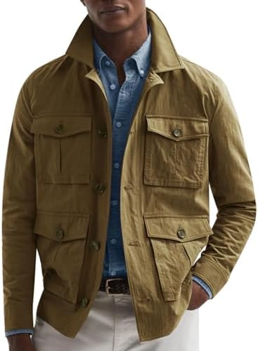 Runcati Mens Lightweight Safari Jacket Casual Button Up Jacket Windproof Work Coat with Pockets