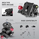 【Lightweight & Durable Design】 Compact and lightweight, this fluid head is 8.8oz (250g) in weight, 2.8" (72mm) in height, and ø1.7" (ø43mm) in its base. Entirely made of aluminum alloy, it has a durable build and a sleek metallic appearance 【360° Rotation & -55°/+90° Tilt】 Comfortable friction damping lets you smoothly rotate the head at 360° or tilt it from -55° to 90° for any shooting camera angle. Use locking knobs to secure and stabilize it for taking sharp photography and videography 【1/4" Arca Type Quick Release Plate】 Compatible with Arca Swiss system, the quick release plate with 1/4" screw can secure the camera via an L shaped hex key magnetically stored in the middle of the fluid head for fast and safe mounting. Locating pins and nonslip rubber pads protect the camera from falling or being scratched 【Detachable Handle for Left/Right Hand】 The 7.3" (18.5cm) handle can be installed on either side of the fluid head by using the hand tighten locking knob for left or right hand use 【Suitable for Various Devices】 With a 6.6lb (3kg) load capacity, the professional fluid head can support DSLR cameras, mirrorless cameras, compact video cameras, and other devices. Compatible with Sony Canon Nikon and other DSLR cameras. A bubble level helps you keep the level straight, and a 1/4" thread is for accessory mounting