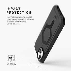 COMPATIBLE WITH MAGSAFE CHARGING: Powerful built-in magnet module locks in place for MagSafe charging compatibility. Compatible with Apple Pay. Flat, contact surface design for optimal seamless magnetic connection. SLIM & LIGHTWEIGHT: Uncompromised defense featuring lightweight co-molded construction, a slim ergonomic design with enhanced corner protection, and a hex pattern for increased shock absorption. Made with 50% recycled materials. ENHANCED FUNCTIONALITY: Ultra-responsive oversized tactile buttons deliver a crisp, clean click-feel for improved functionality—lanyard card compatibility (lanyard not included) for on the go functionality. SCREEN & CAMERA PROTECTION: Soft raised screen surround to protect the screen and raised camera bezel to protect the lens. MILITARY GRADE DROP PROOF TESTED: Tested to 15 ft. (4.6 meters) drop protection. Third Party lab certified to Mil Spec Standards.