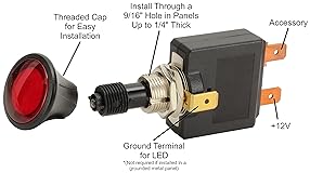Secure the Switch with 2 Nuts in up to a 1/4" Panel Rated to 50 Amps at 14 Volts 1/4" Male Copper Leads 9/16" Diameter Mounting Shaft with 2 Flat Sides to Prevent Turning Great for Headlights or Accessory Lights Red LED Indicator Light to Ensure Power is On