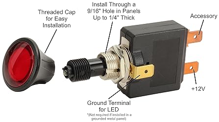 - The lighted Push/Pull switch from Fastronix features a heavy duty plastic body and knob with a red LED indicator and 1/4" copper leads to be able to power accessories up to 50 Amps at 14 VDC. Simply run power through the switch to the accessory of your choice and connect the lead behind the knob to ground. This switch is perfect when a push/pull style switch is desired but you need a positive indication when your accessory is on. Note: If the switch is mounted in a panel which is metal and grounded, no ground wire is necessary. When mounted, all wires are located behind the mounting panel. The diameter of the mounting shaft is 9/16". There are 2 flat sides on the shaft to prevent the switch from turning after it is installed. The flat sides are 1/2" apart. To install, drill a 1/2" hole and use a file to extend the hole to 9/16" leaving 2 flat sides for the switch.
