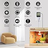 【Multifunction】This humidity controller plug socket with sensor has 4 operation modes (humidification mode, dehumidification mode; heating mode, cooling mode); temperature and humidity alarm function; temperature and humidity calibration; reset function; data memory function, can save all setting parameters after power failure; temperature unit ℃ / ℉; key tone settings, etc. 【Humidity/Temperature Control】Humidity control range: 20~95%RH. Temperature control range: -10°C~50°C/14°F~122°F; This humidistat switch is easy to program. Set start and stop humidity/temperature to make the connected devices work according to the program. You can also set the alarm function. When the humidity/temperature exceeds the set value, the humidistat outlet will sound an alarm. 【Humidity/Temperature Calibration】Hold down the "UP/CLK", "MODE" button to perform real-time calibration of humidity and temperature. Humidity correction range: -10~10%RH. Temperature correction range: -9.9~9.9°C. Press and hold the "MODE" button to save and exit the calibration after it is completed. 【Safe, Lightweight, Universal】The humidity controller is made of ABS material, which is safer and more convenient to use. It can be used in refrigerators, incubators, pet reptiles, poultry houses, glass containers, aquaculture, greenhouses, household and other areas with temperature and humidity requirements. 【Fault Indication Function】When the sensor is not connected or the measured data is out of the range of the thermostat outlet or there is a short circuit, the screen will display fault indication so that you can make adjustments in time.
