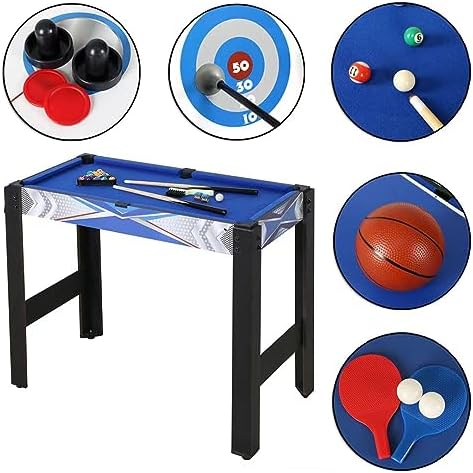 - 5 IN 1 with ALL COMPONENTS: 🔥A table tennis table, 2 bats & ping pong balls, 🔥A pool table, cue, pool balls & ball triangle, 🔥An archery target board, bow & arrows, 🔥A slide hockey table, 2 x puck and pushers, 🔥A basket ball shooting system with a basket ball & a inflator