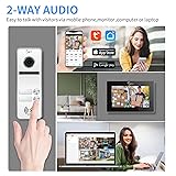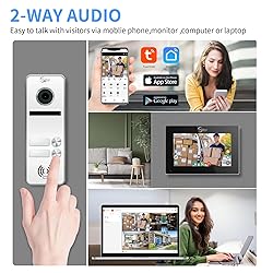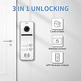 2 UNIT DESIGN: 1 outdoor camera and 2 indoor screens for visual intercom doorbell system, supports two occupants in one building. Individual monitors without interfering with each other 7 INCH TOUCH MONITOR:7-inch touch screen, door answering, monitoring and unlocking, two-way intercom Silent door intercom and doorbell kit.7-inch TFT touch screen monitor, ultra-slim design, support Smart Touya APP Wireless WiFi, hands-free intercom (Note that the monitor supports wireless connection, but the doorphone and monitor need wired connection) 3-in-1 UNLOCKING AND AUTOMATIC VIDEO RECORDING: The device has multiple unlocking methods. You can unlock it by ID card, APP and screen monitor. Very convenient and flexible. When motion detection is triggered, the camera will automatically capture or record video and save it in the monitor's Micro SD card (including 32G SD card). You can view the footage via your smartphone at any time. 1080P HD IR night vision, IR night vision high resolution access control surveillance camera, easy to install, stable wired connection, suitable for home security.140º wide angle with rain cover, built-in speaker and microphone. Can be used in flats, villas, hotels, offices, public buildings. Support video intercom for up to 12 security monitoring devices. REAL-TIME MONITORING, DON'T MISS ANY VISITOR: With the latest IP technology, when a visitor presses the doorbell, your mobile phone will receive a call from the TUYA APP, you can see, hear and talk to the person outside the door, you can even unlock the door remotely from anywhere with your smartphone, don't miss any delivery or keep your guests waiting.