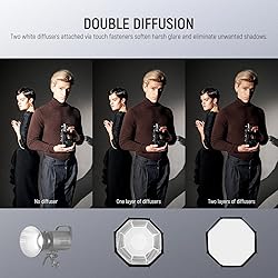 【Professional Octagon Softbox】 This octagonal softbox features an opening size of 17.7" x 11.8"/45 x 30cm, with a smooth, even silver internal coating on the thickened nylon cloth that broadens, diffuses, and softens light while retaining the original color rendition. Includes two layers of light diffusers and a honeycomb grid for optimal output 【Quick Folding & External Ribs】 Pull up the ribs to unfold and lock this softbox in seconds, then just push and hold the quick release buttons to fold up. 8 highly resilient ribs bring incomparable durability and an impeccable shape that can withstand tens of thousands of presses without deformation, and are attached outside the softbox, ensuring more smooth inner coating and much even light reflection to soften harsh glare and eliminate unwanted shadow 【Honeycomb Grid & Diffusers】 The internal and external diffusers can be combined for an even softer and more diffused light, and can be fastened via touch fasteners for easy assembly. The honeycomb grid directs light at 45° and reduces spill, providing a distinctive soft yet punchy lighting effect that defines the model's facial structure 【Standard Bowens Mount】 Seamlessly compatible with Godox sl60w Aputure Amaran 60D 60x S NEEWER Q4 Vision 4 CB200B RGB CB60 MS60B MS60C MS150B and other Bowens mount studio strobe lights and continuous LED video lights 【Portable Drawstring Bag】 At merely 2.16lb/980g, this collapsible softbox can be folded with a diameter of 7.5"/19cm, is easy to store and transport inside the included drawstring bag. Perfect for portraits, product photography, beauty & fashion shoots, weddings, corporate headshots, and other photography styles