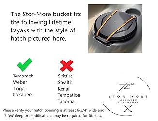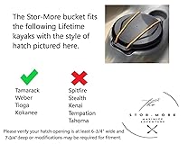 Create a usable and easy to access place to Stor-More items in your Kayak by inserting the Stor-More bucket container into the hatch hull of select Lifetime kayaks. This versatile dry box is a great addition to any kayaker's gear collection. No more worrying about stored items sliding into unreachable areas inside the kayak hull. Made from durable, thick, hard polypropylene plastic, that won't rip, tear, crack, or break down when exposed to salt water or prolonged sunlight. 2X the storage depth and 3X thicker walls and base compared to other kayak buckets hull storage solutions. Easy to install and remove. Includes optional neoprene risers that can be attached to the base to adjust the height of placement in kayak hatch opening. 100% recyclable and made from recycled products, to help protect and preserve the environments we love to explore. Hatch opening width of 6.75" and depth of 7.75" required. *Compatible* with Lifetime Tamarack Angler, Weber, Kokanee and Tioga kayaks. *NOT* compatible with Tamarack Pro 103, Temptation, Kenai, Tahoma, Envoy, or Stealth model kayaks. Will fit Spitfire model but will cause the hatch cover to stick up slightly and not not seal completely. For Tamarack model Kayaks with two hatch openings, the back opening is slightly larger and the bucket may not seal completely, but fits the front hatch opening well. May fit other models.