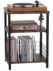 Multi-Functionality: This record player table boasts an expansive range of applications due to its multifunctional design. Measuring 11.8’’ D x 15.8’’ W x 26.2’’ H, it serves as an efficient record storage table that seamlessly organizes all your vinyl records, albums, and CDs. Not only can it function as a vinyl record display table or a record player cabinet, but it also doubles as a turntable stand, nightstand, or end table - perfect for any living room or bedroom setting. 3 Layer Record Player Stand: Besides being a stand for your turntable, the table helps keep your precious vinyl records well-organized. The second and third tier can easily store up to 100 albums in total. The designated compartments or shelves allow for convenient categorization based on genres, artists, or release years. This feature ensures easy access to your records and enables you to maintain an orderly collection. High-Quality Material: The table is crafted from high-quality wooden and metal to ensure durability and longevity. The robust construction can withstand max load weight 75 lbs of turntables and substantial record collections. This end table comes with 4 adjustable foot pads which can be easily adjusted to fit the height of your needed. Additionally, the foot pads can protect your floors from scratches and scuffs. Irrespective of the frequency of use, it promises to stay stable and stylish. Aesthetic Appearance & Practical: This record player table is a visual masterpiece that blends into any interior setting. With its vintage design and modern accents, it enhances the aesthetic appeal of your room, while complementing modern décor trends seamlessly. The second layer has an open design, which is convenient for access. It can store snacks, books, or other items within reach. The third layer Iron wire frame and U-shaped wire can protect your vinyl records from falling or slipping. Easy Assembly: The record player table prioritizes the user's convenience with easy assembly instructions. All necessary tools are included, allowing even those with minimal DIY skills to set it up effortlessly. By opting for this table, music lovers who prefer a quick and hassle-free setup can start enjoying their favorite tunes without a long, complicated assembly process.