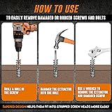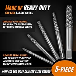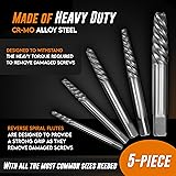 Effortless Extraction: Our screw extractor kit is designed for hassle-free screw removal for DIY enthusiasts, featuring a 5-piece damaged screw extractor set designed for precision and ease of use. This screw extractor set includes extractor sizes #1, #2, #3, #4 and #5 which can be used to remove screws and bolts from 1/8" to 3/4" in diameter. Complete 5-Piece Solution: Versatile easy out screw extractor set; Works on multiple sizes of stripped head screws; Includes spiral screw extractors designed for maximum grip; Compatible with standard power tools and hand drills. Superior Design: Durable extractor de tornillos with hardened construction; Features precision-machined spiral flutes for optimal bite; Deep threading grabs broken screws securely; Easy out tool designed for tough screw extraction tasks. Universal Application: Reliable bolt extractor bit for automotive repairs, woodworking, and home projects; Effectively removes damaged fasteners from metal, wood, and plastic; Works on hex, Phillips, flathead, and torx screws. Easy to Use: Simple and easy-to-use bolt extractor set for beginners and professionals; Drill into damaged screw, insert extractor, and rotate counterclockwise; Includes varied sizes for comprehensive screw extraction needs.