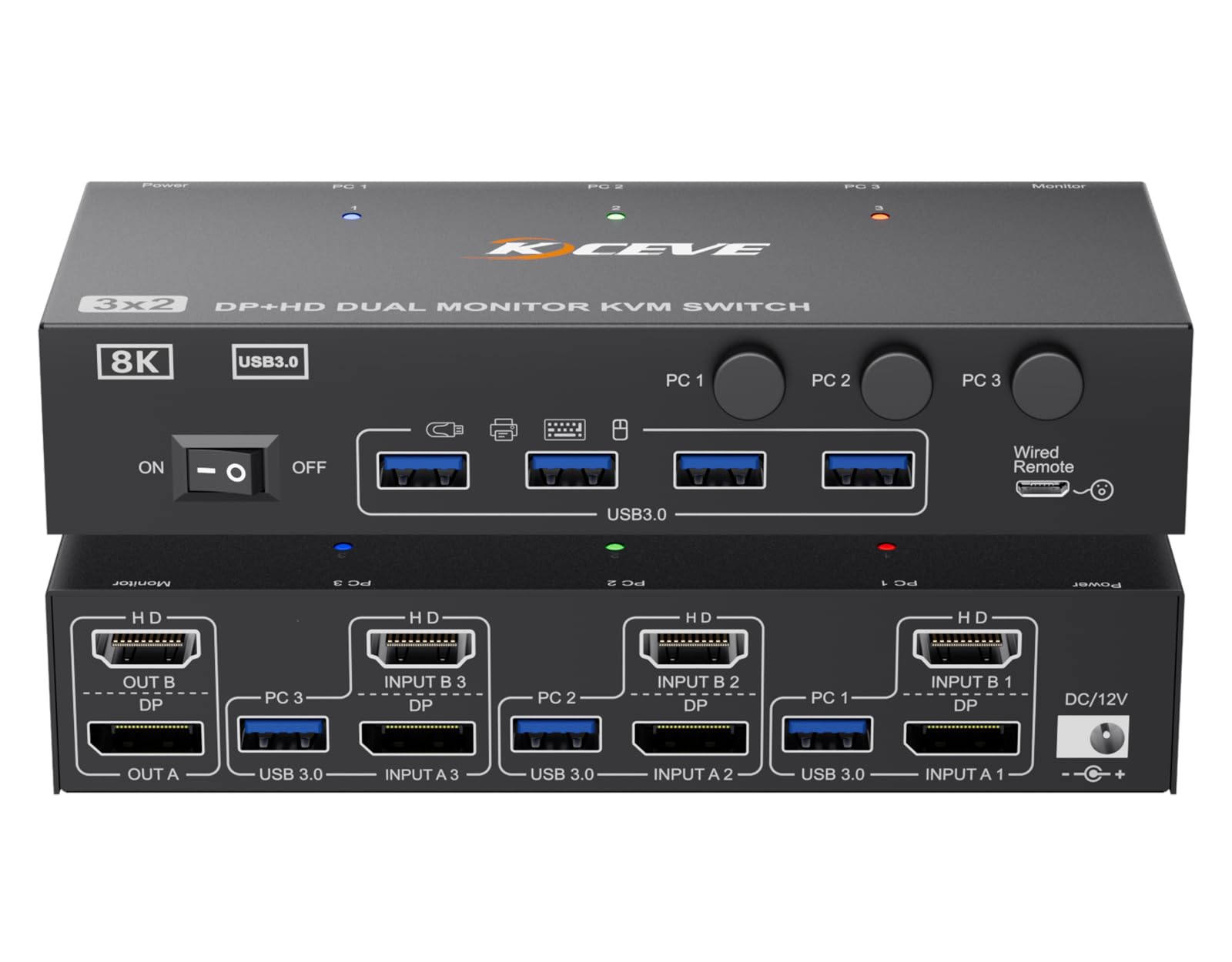 - 【𝐊𝐕𝐌 𝐒witch 𝐃ual 𝐌onitor 𝟑 computers】This 2 monitor KVM switch allow you to control 3 computers or laptops by only one set of wired or wireless keyboard mouse,share 4 USB 3.0 devices and 2 monitors(Extend display mode or copy display mode). Please note that the extended mode can output two different screens, and the copy mode can output two identical screens.